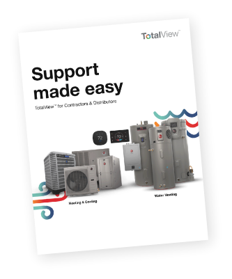 TotalView™ integration is available through Rheem® Family of Brands products that are either powered by EcoNet technology—water heaters powered by EcoNet technology and heating & cooling products paired with an EcoNet Smart Thermostat—or that work with EcoNet technology—heating & cooling products paired with the ecobee Smart Thermostat Lite | Works with EcoNet Technology. This integration includes communication between either the EcoNet or ecobee homeowner app, the Contractor App and the TotalView dashboard.