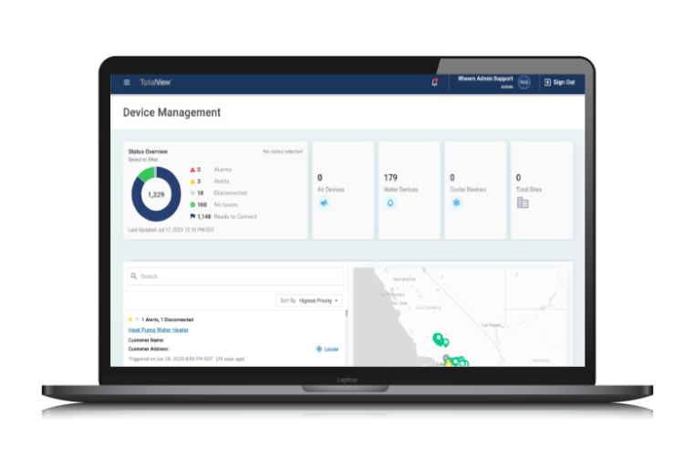 Part of the overarching EcoNet ecosystem, TotalView™ is a family of digital tools that enables near-real-time monitoring and configuration of EcoNet-connected products from anywhere you have Internet access. This platform offers a consolidated dashboard that heating & cooling and water heating contractors can easily access for a complete view of all homeowners’ units and any active alerts—all powered by EcoNet technology.